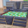 Ce texte est une description marketing pour un lit double de luxe. Il met en avant son design audacieux et contemporain, caractérisé par une tête de lit et un cadre de lit imposants avec des motifs géométriques en relief, soulignés par des liserés dorés. Le lit est revêtu de velours gris anthracite et est vendu avec deux tables de chevet assorties et intégrées. L’ensemble est décrit comme fonctionnel, robuste et idéal pour créer une atmosphère de prestige dans une chambre à coucher.