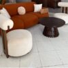 Ce salon au design sculptural se compose d’un canapé aux courbes organiques couleur terre cuite, d’une table basse avec un piètement original en lattes de bois et de deux fauteuils uniques. Ces fauteuils, avec leur assise ronde en tissu bouclé clair et leur structure en bois aux lignes épurées, complètent harmonieusement l’ensemble. Parfaitement équilibré entre modernité et confort, cet ensemble est idéal pour un intérieur audacieux et élégant.